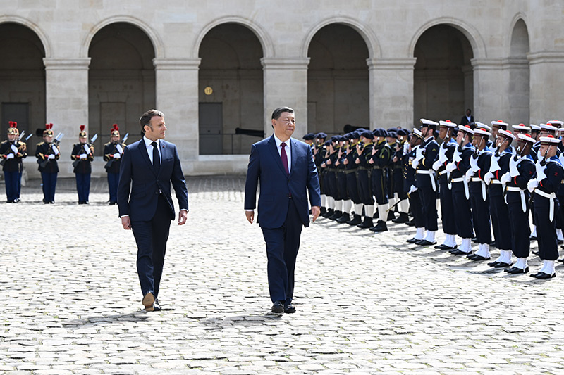 习近平和夫人彭丽媛乘车抵达时,马克龙和夫人布丽吉特在下车处热情迎接。在雄壮的进行曲中,两国元首步入广场。军乐团奏中法两国国歌。两国元首检阅法兰西共和国卫队和陆海空三军仪仗队,并观看分列式。随后,习近平和彭丽媛同法方主要官员一一握手致意。马克龙夫妇同中方陪同人员分别握手致意。