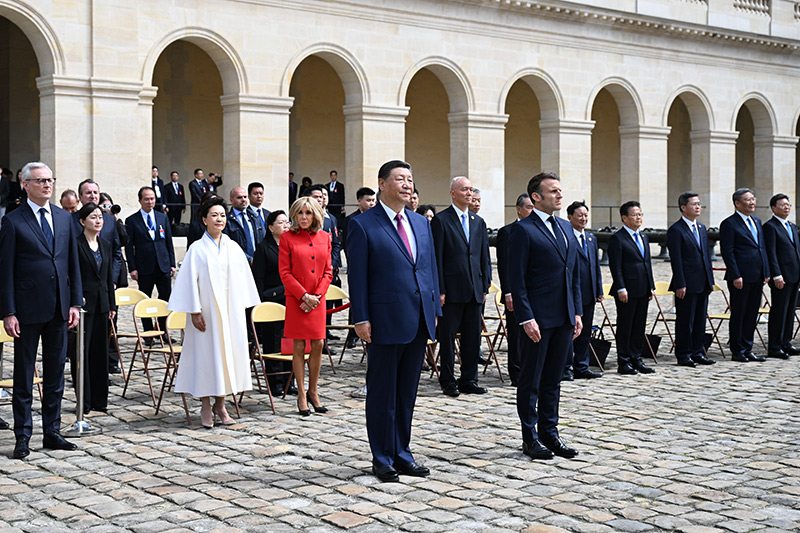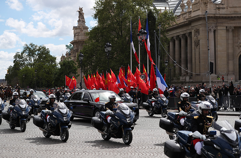 五月的巴黎,风和景明。塞纳河畔,荣军院金色穹顶熠熠生辉,五星红旗和蓝白红三色旗迎风飘扬。