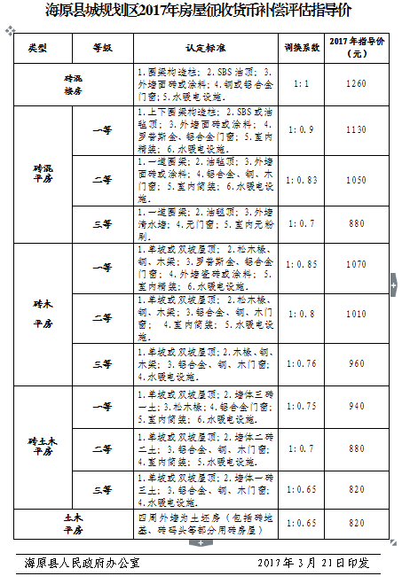 关于印发海原县城规划区2017年房屋征收货币补偿评估指导价的通知