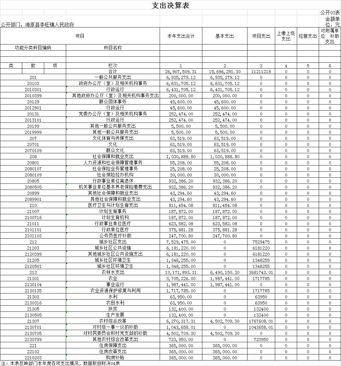 2018年度支出合计26907509.31元,其中:基本支出15696291.3元,占58.33%;项目支出11200218.01元,占41.67%;上缴上级支出0元,占0%;经营支出0元,占0%;对附属单位补助支出0元,占0%。