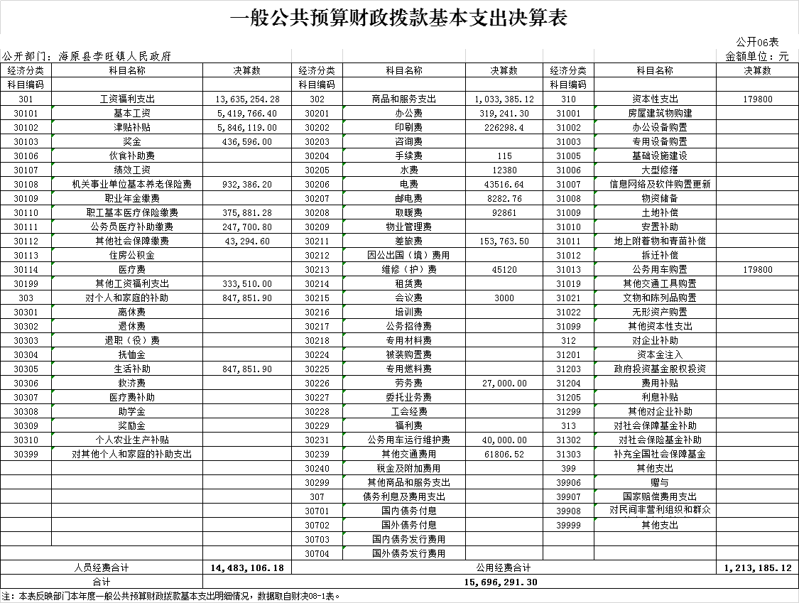 2018年度一般公共预算财政拨款基本支出15696291.3元,其中:人员经费14483106.18元,公用经费1213185.12元。支出具体情况如下: