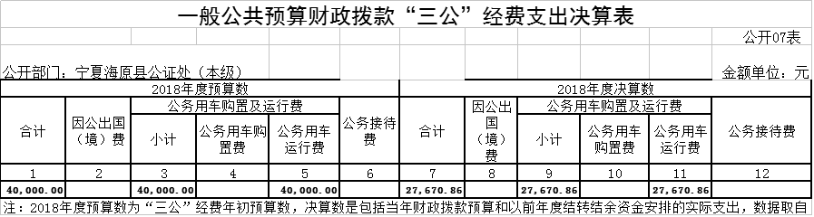 2018年度“三公”经费一般公共预算财政拨款支出年初预算为40,000.00元,支出决算为27,670.86元,完成年初预算的69.18%。与上年相比,减少9,649.56元,下降25.86%,决算数小于年初预算数的主要原因是:严格执行中央八项规定,大力压缩公务用车运行维护费。