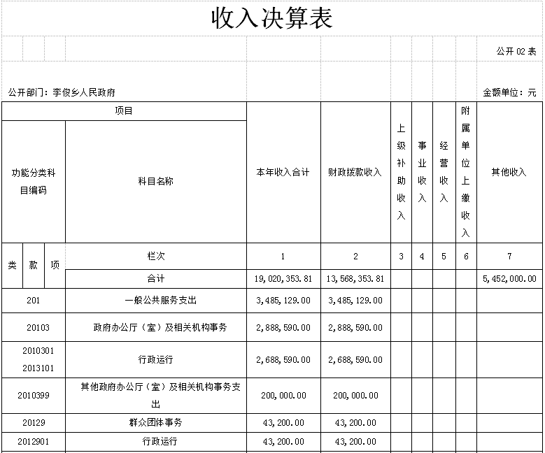 2018年度收入合计19020353.81元,其中:财政拨款收入13568353.81元,占71.34%;上级补助收入0元,占0%;事业收入0元,占0%;经营收入0元,占0%;附属单位上缴收入0元,占0%;其他收入5452000元,占28.66%。