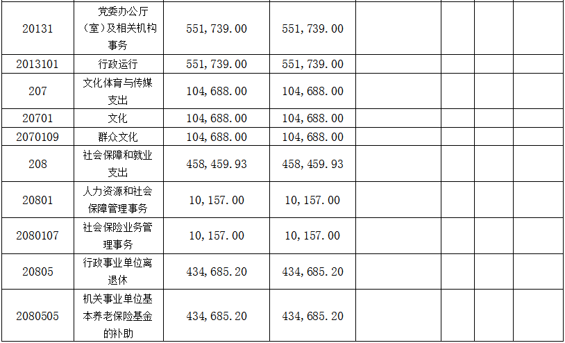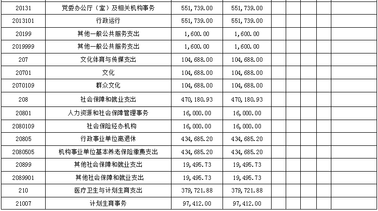 4、一般公共服务(类)党委办公厅(室)及相关机构事务(款)行政运行(项)。年初预算为843169.64元,支出决算为551739元,完成年初预算的65.4%,决算数小于预算数的主要原因是2018年初预算是按2017年10月份职工人数和工资基数编制的,实际执行时人员与预算时人员不一致。所以决算数小于预算数。
