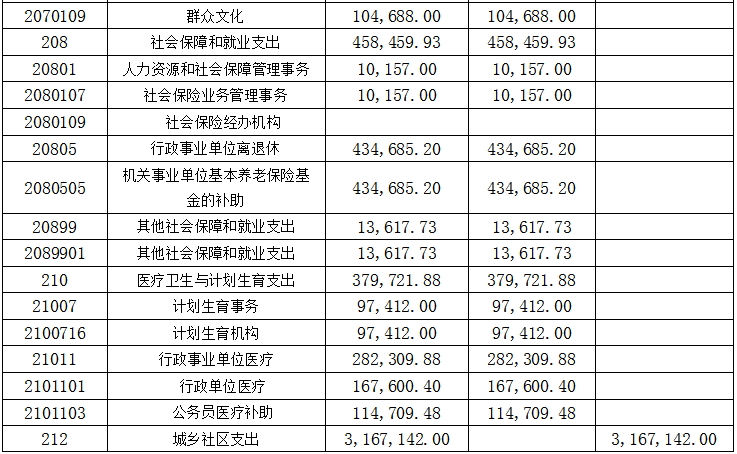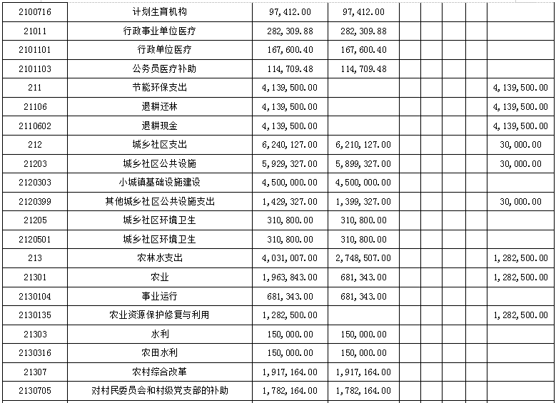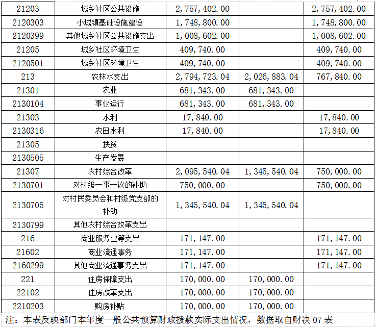 2018年度一般公共预算财政拨款支出10708931.18元,主要用于以下方面:一般公共服务(类)支出3463049.33元,占32.33%;文化体育与传媒(类)支出104688元,占0.97%;社会保障和就业(类)支出458459.93元,占4.30%;医疗卫生与计划生育(类)支出379721.88元,占3.55%;城乡社区(类)支出3167142元,占29.57%;农林水(类)支出2794723.04元,占26.09%;商业服务业支出171147元,占1.60%,住房保障(类)支出170000元,占1.59%。
