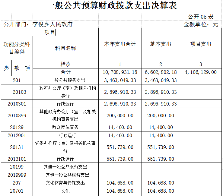 2018年度一般公共预算财政拨款支出10708931.18元,占本年支出合计的64.95%。与上年相比,一般公共预算财政拨款支出减少9470494.36元,下降46.93%,主要原因是2017年有小城镇基础设施建设项目10000000元,2018年基础设施建设类项目减少。