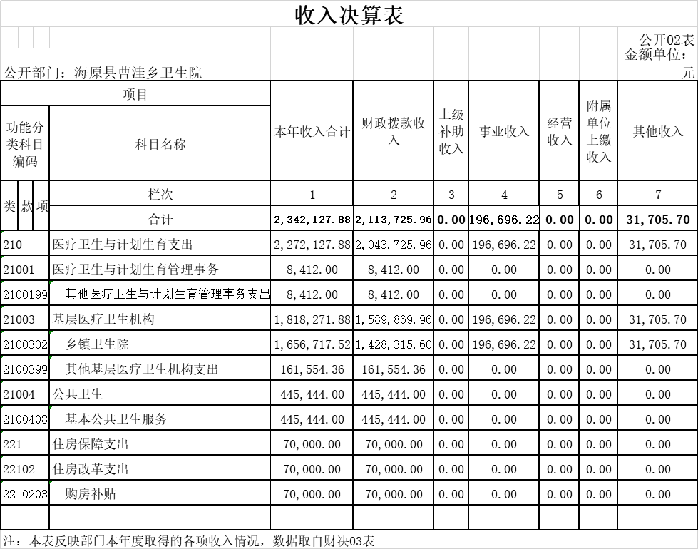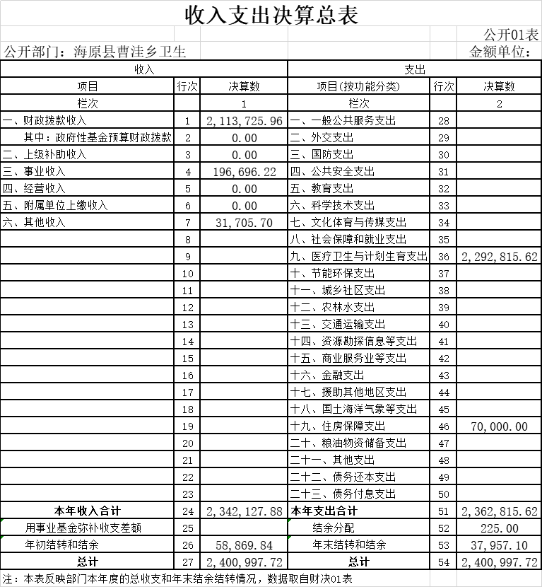 2018年度收入总计2,342,127.88元,支出总计2,362,815.62元。与上年相比,收入总计增加489,485.32元,增长26.42%,主要原因是人员的增加和基本公共卫生服务经费增长及新业务的开展。支出总计增加500,646.67.元,增长26.88%,主要原因是人员支出的增加和基本公共卫生服务投入加大。