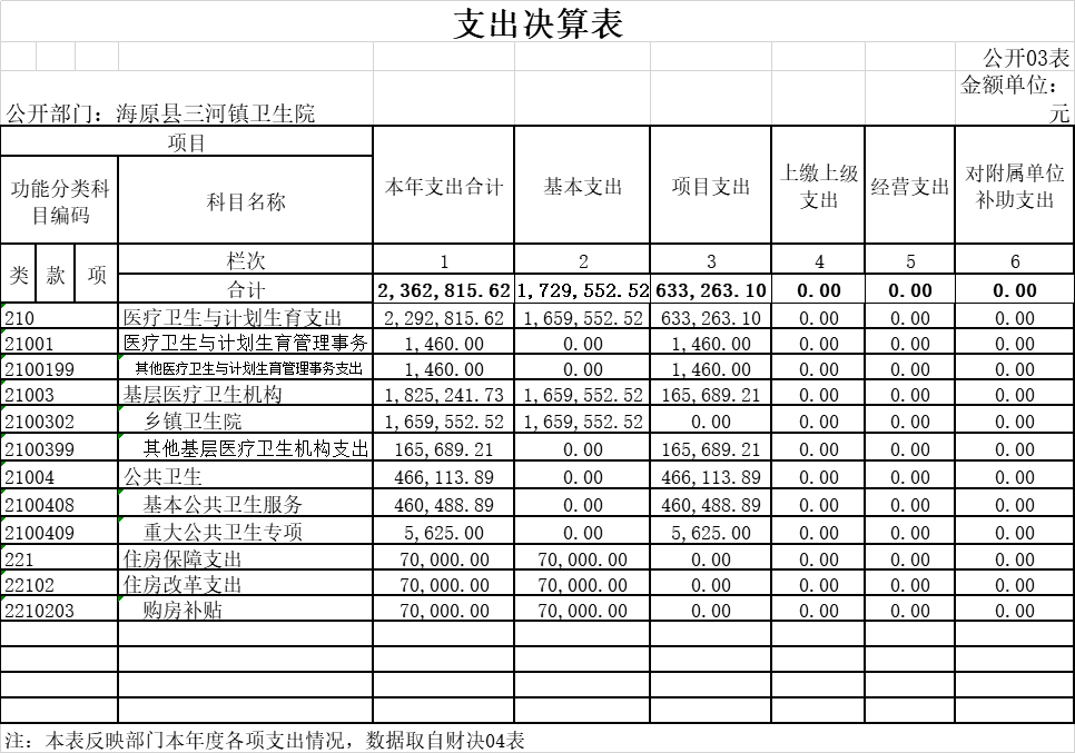 4、医疗卫生与计划生育支出(类)公共卫生(款) 基本公共卫生服务(项)。年初预算0元,支出决算为460,488.89元,超年初预算460,488.89元;主要原因是所有乡镇卫生院预算在一起,没有办法分出本单位预算数,决算数是我院乡村两级公共卫生服务项目经费