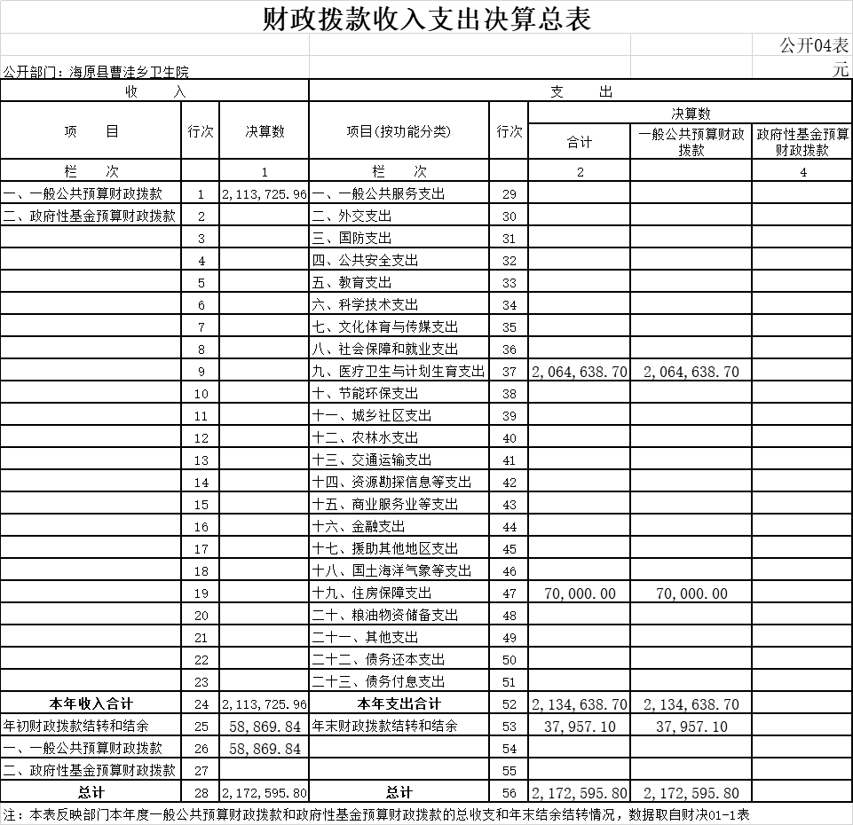 2018年度财政拨款收入总计2,113,725.96元,支出总计2,134,638.70元。与上年相比,财政拨款收入增加618,895.96元,增长了41.40%;支出增长了629,918.54元,增长41.86%,主要原因是人员的增加和基本公共卫生服务经费增长。