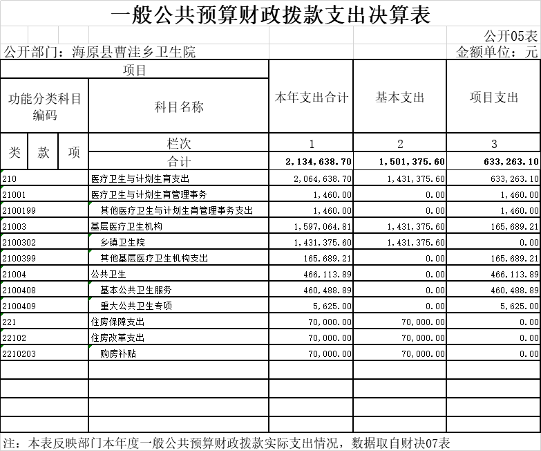 5、医疗卫生与计划生育支出(类)公共卫生(款) 重大公共卫生专项(项)。年初预算0元,支出决算为5,625.00元,超年初预算5,625.00元;主要原因是所有乡镇卫生院预算在一起,没有办法分出本单位预算数,决算数是我院中医馆建设经费。