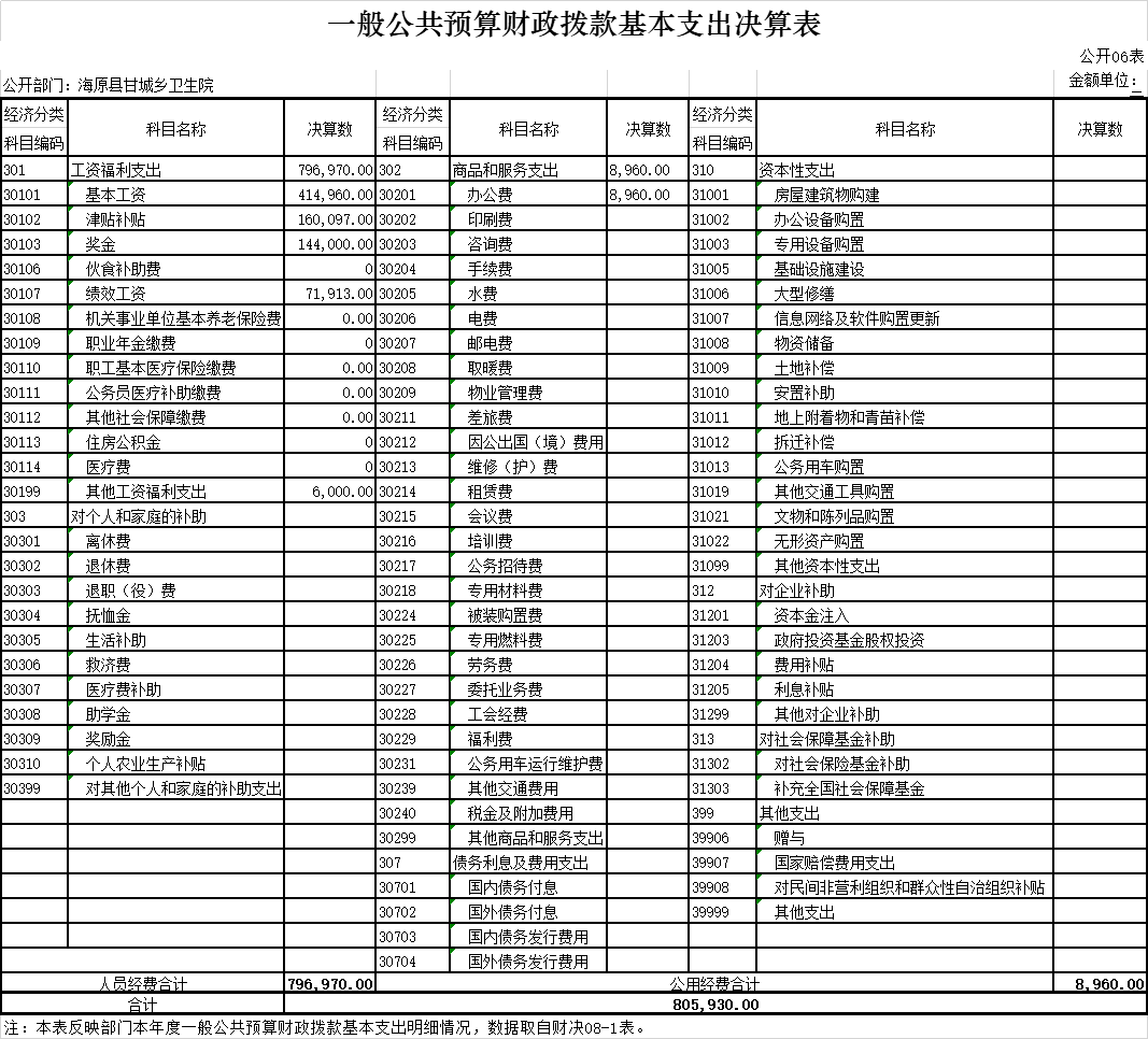 1.工资福利支出796,970.00元,超年初预算796970.00元,主要原因为乡镇卫生院未单独做预算;较上年决算数增加124991元,增长18.60%。