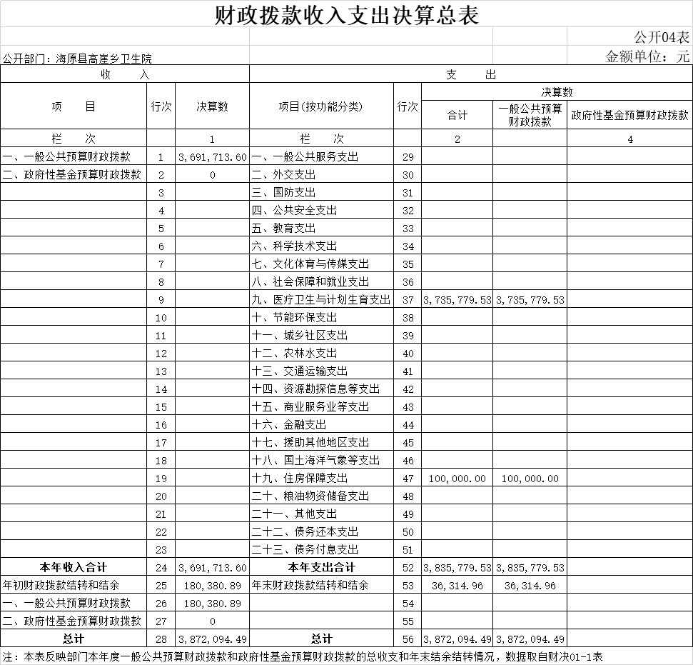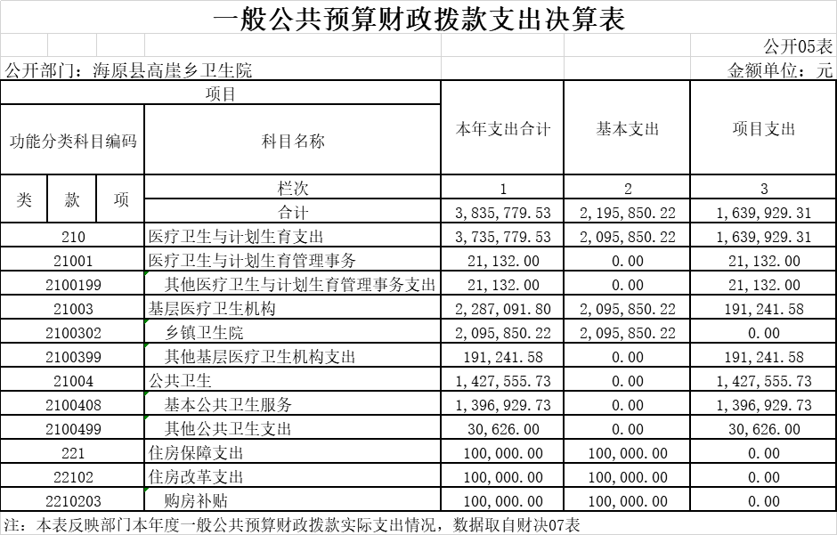 2018年度一般公共预算财政拨款支出年初预算为0元,支出决算为3,835,779.53元,超年初预算3,835,779.53元。决算数大于预算数的主要原因是乡镇卫生院预算由卫生健康局统一预算。其中: