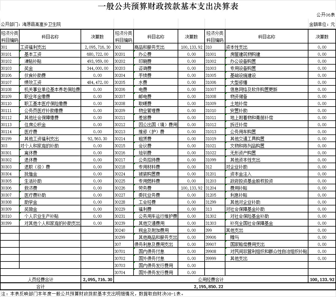 1.工资福利支出2,095,716.30元,较年初预算数增加0元,增长0%,主要原因是乡镇卫生院预算由卫生健康局统一预算;较上年决算数增加324531.68元,增长18.32%。