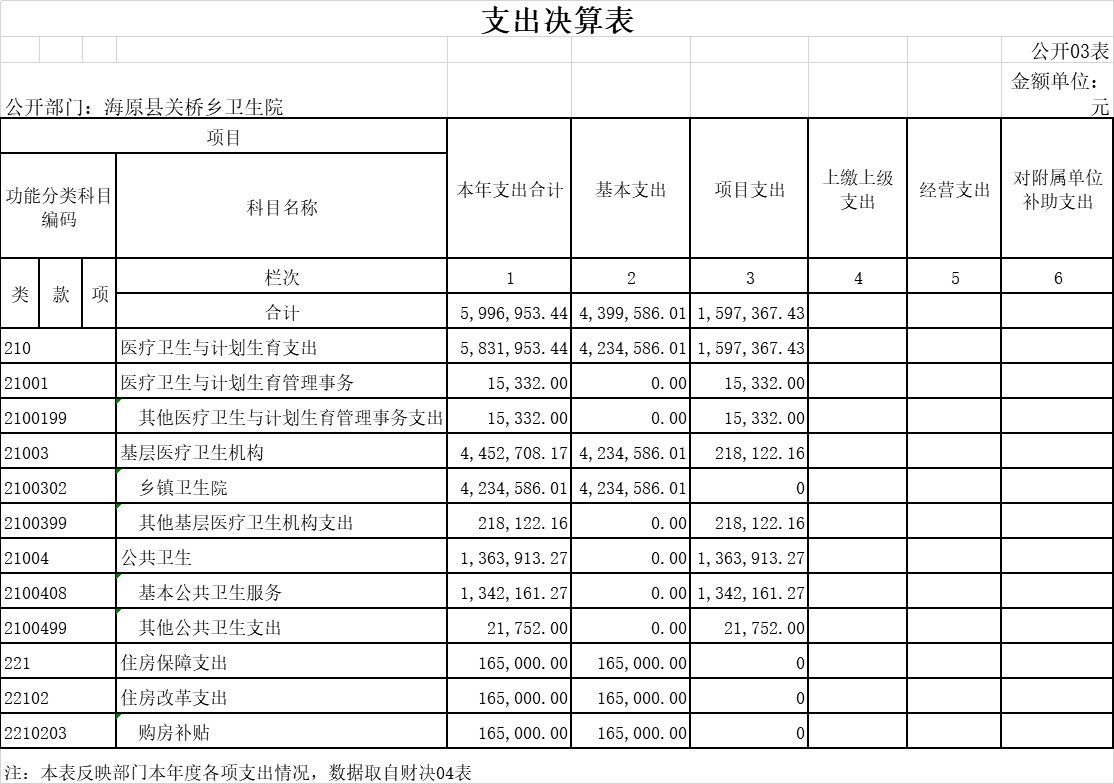 6.住房保障支出(类)住房改革支出(款)购房补贴(项)。年初预算为0.00元,支出决算为165000.00元,超年初预算165000.00元,决算数大于预算数的主要原因乡镇卫生院预算一起做,无法分出本单位预算和列支中央及自治区专项资金和人员的变动。