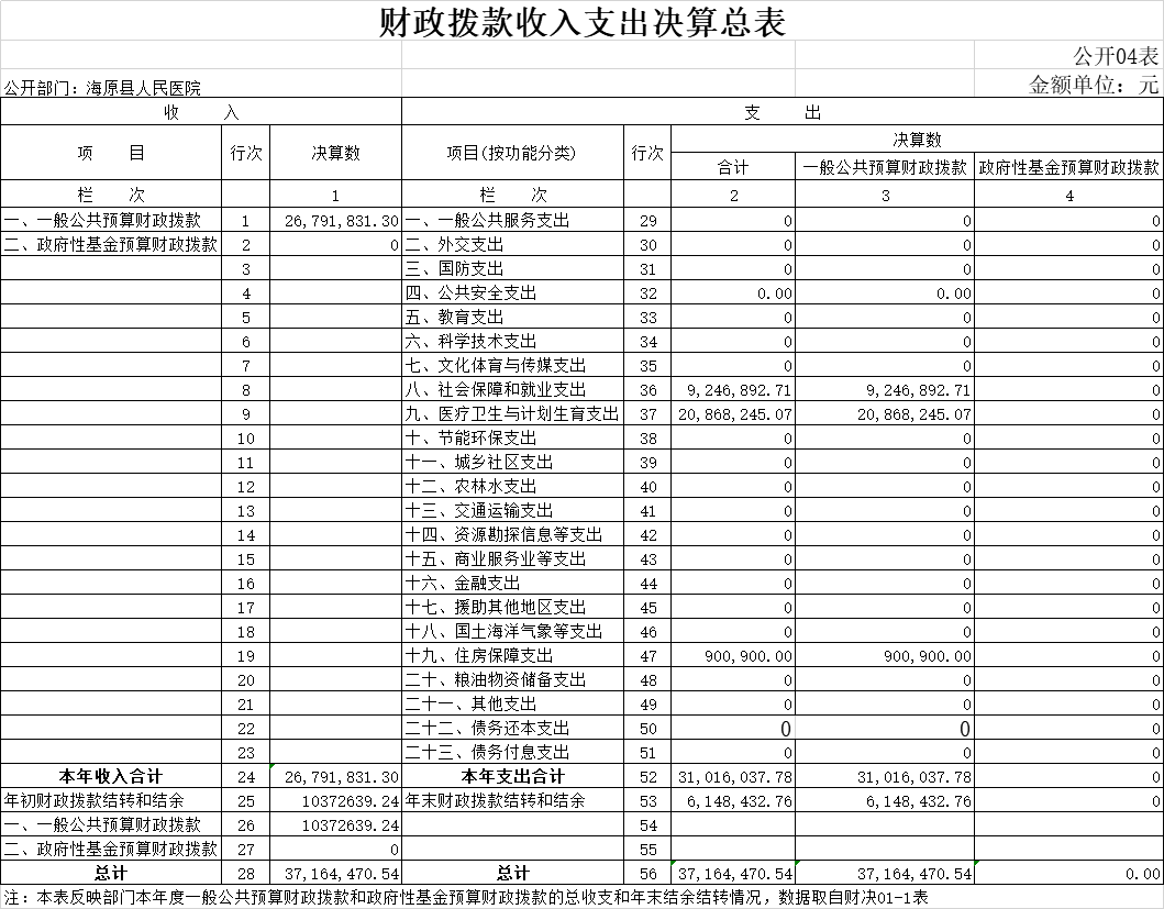 2018年度财政拨款收入总计 26,791,831.30元,支出总计31,016,037.78元。与2017年相比,财政拨款收入总计减少15,457,559.30元,下降36.59%,主要原因是上年度补拨清算以前年度养老保险金及项目资金拨款减少。财政拨款支出总计增加2,564,061.21元,增加7.41%,主要原因是调资增加及公立医院薪酬制度改革绩效工资增加