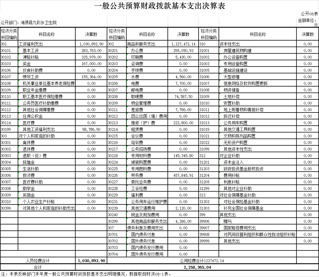 1.工资福利支出1030892.9元,较年初预算数增加0元,增长0%,主要原因是乡镇卫生院预算由卫生健康局统一预算;较上年决算数增加327503.9元,增长46%。