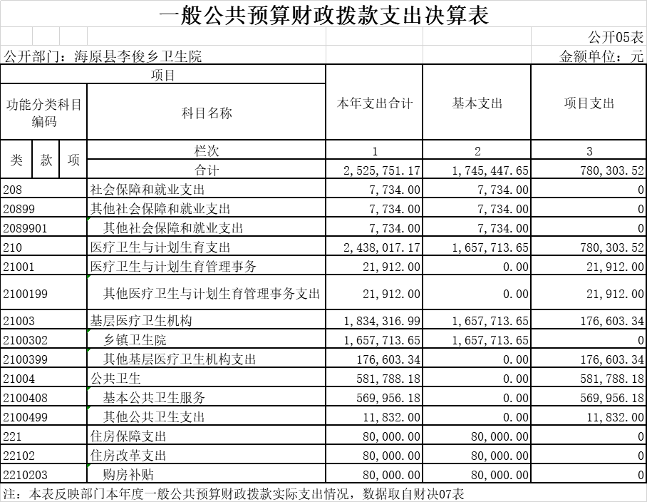 2018年度一般公共预算财政拨款支出年初预算为0元,支出决算为2,525,751.17元,超年初预算2,525,751.17元。决算数大于预算数的主要原因是乡镇卫生院预算由卫生健康局统一预算。其中:
