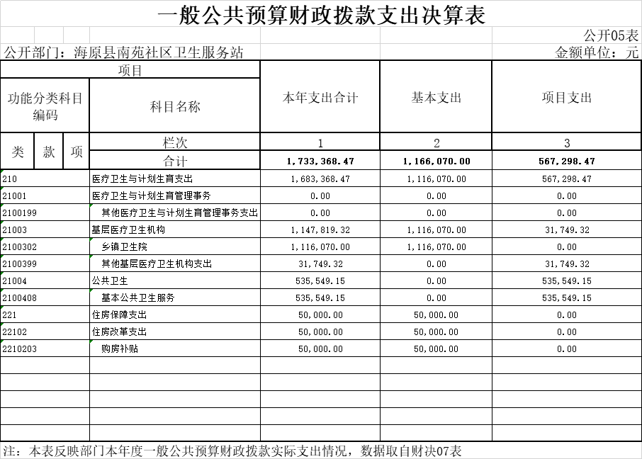 2018年度一般公共预算财政拨款支出1,733,368.47元,占本年支出合计的89.33%。与上年相比,一般公共预算财政拨款支出(增加)11,728.60元,增长7.25%,主要原因是人员支出的增加和基本公共卫生服务投入增加。