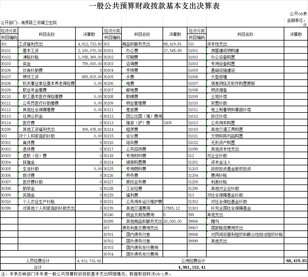 2018年度一般公共预算财政拨款基本支出4981152.41元,其中:人员经费4912732.6元,公用经费68419.81元。支出具体情况如下: