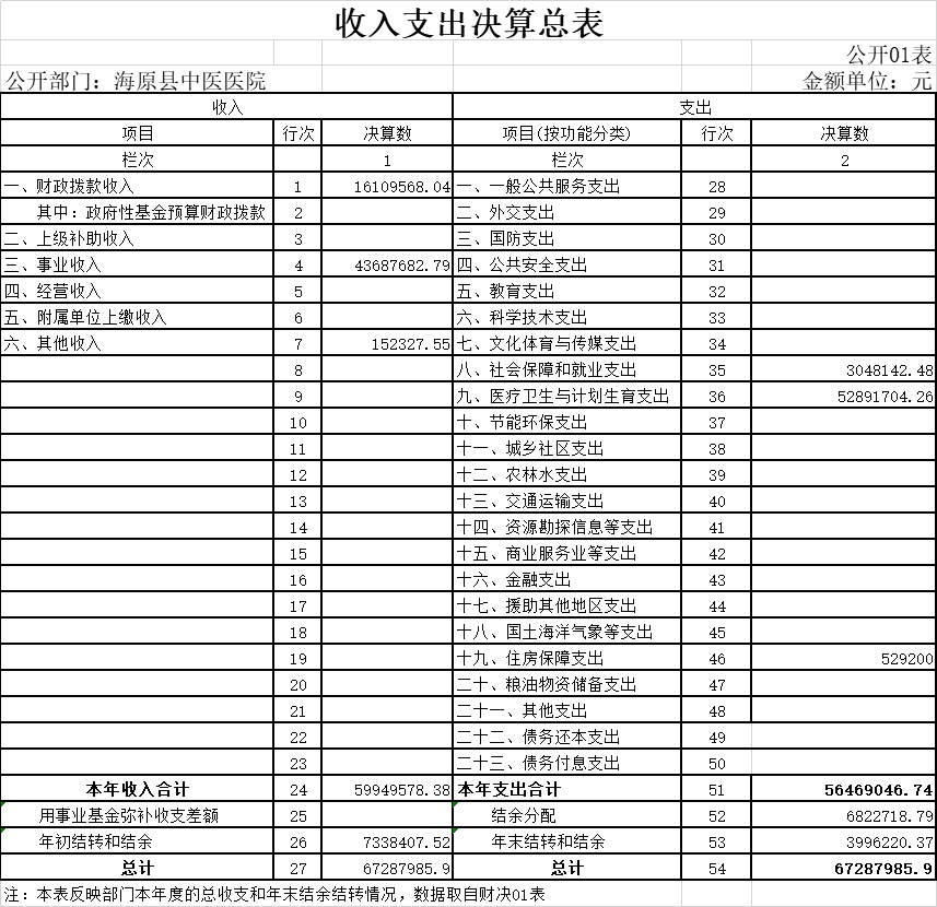 2018年度收入总计59,949,578.38元,支出总计56,469,046.74元。与上年相比,收入总计增加2,518,787.13元,增长4.39%,主要原因是病人量增加,业务收入增加。支出总计增加7,413,613.91 元,增长15.11%,主要原因是业务收入增加,药品及耗材成本增加。