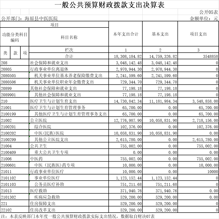 2018年度一般公共预算财政拨款支出18,308,184.82元,占本年支出合计的32.42%。与上年相比,一般公共预算财政拨款支出增加313,971.47 元,增长1.74%,主要原因是本年度财政项目资金采购中医诊疗设备及信息化建设支出。