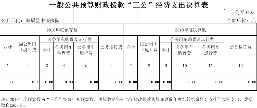 2018年度“三公”经费一般公共预算财政拨款支出预算为0元,支出决算为0元,完成预算的0%,其中:因公出国(境)费支出决算为0元,完成预算的0%;公务用车购置及运行费支出决算为0元,完成预算的0%;公务接待费支出决算为0元,完成预算的0%。2018年度“三公”经费支出决算数与预算数一致。