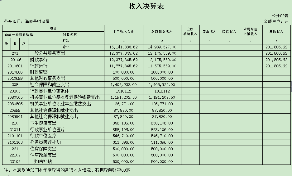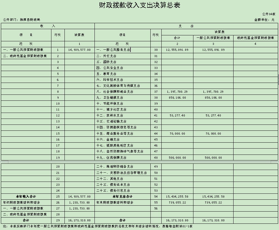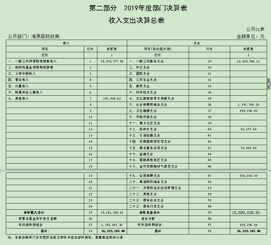 2019年度收入总计15,141,383.62元,支出总计15,699,929.80元。与2018年度相比,收入增加603935.28元,增加4.2%,主要原因是新增人员工资,养老金等,支出增加1029597.41元,增长7.01%,主要原因是加大绩效评价力度等。