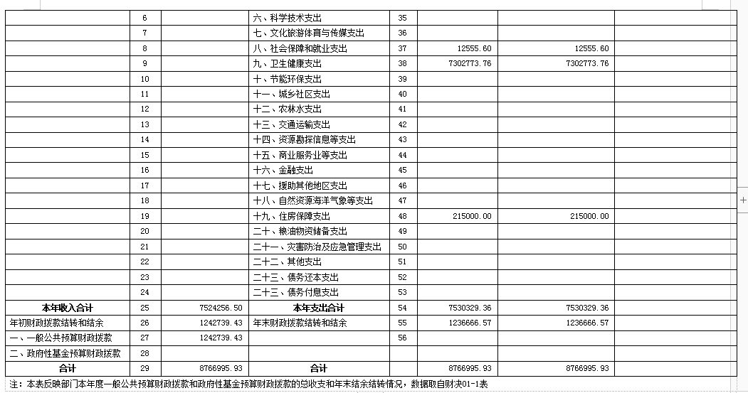 (一)一般公共预算财政拨款支出决算总体情况。2019年度一般公共预算财政拨款支出7530329.36元,占本年支出合计的54.27%。与2018年度相比,一般公共预算财政拨款支出增加490182.15元, 主要原因是基层医疗卫生机构卫生院财政拨款支出增加 143693.53元;公共卫生财政拨款支出增加 346488.62元。