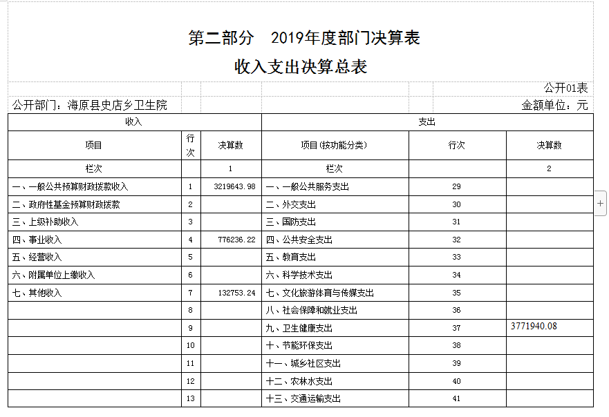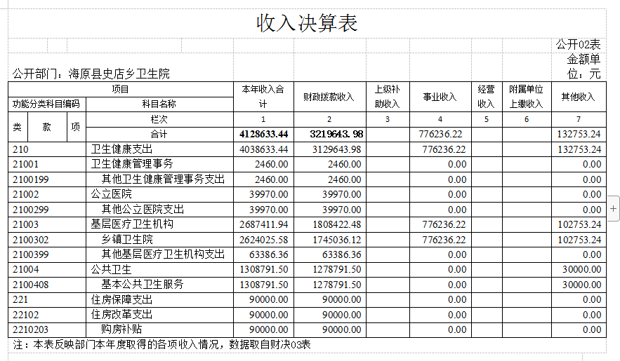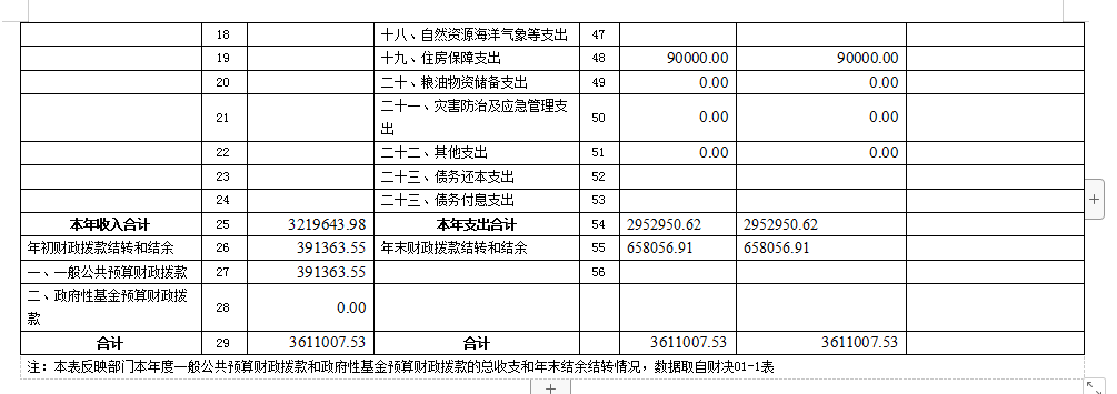 2019年度财政拨款收入总计3219643.98元,支出总计2952950.62元。与2018年度相比,财政拨款收入增加430690.20元,增长15.44%,主要原因是本年人员经费和项目经费增加。财政拨款支出增加2741878.82元,增长7.7%,主要原因是本年支付规培生工资和村级基本公共卫生服务经费。