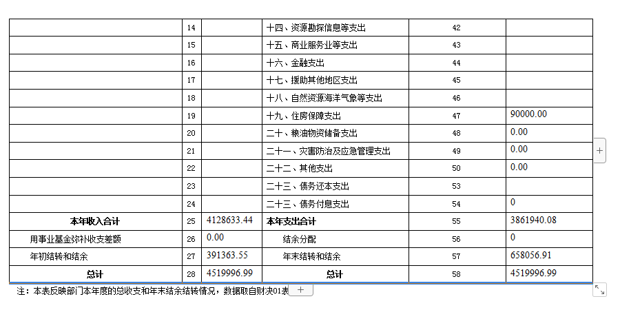 2019年度收入总计4128633.44元,支出总计3861940.08元。与2018年度相比,收入增加1046819.35元,增长33.97%,主要原因是本年事业收入和其他收入增加。支出增加831445.65元,增长27.44%,主要原因是本年人员经费增加。