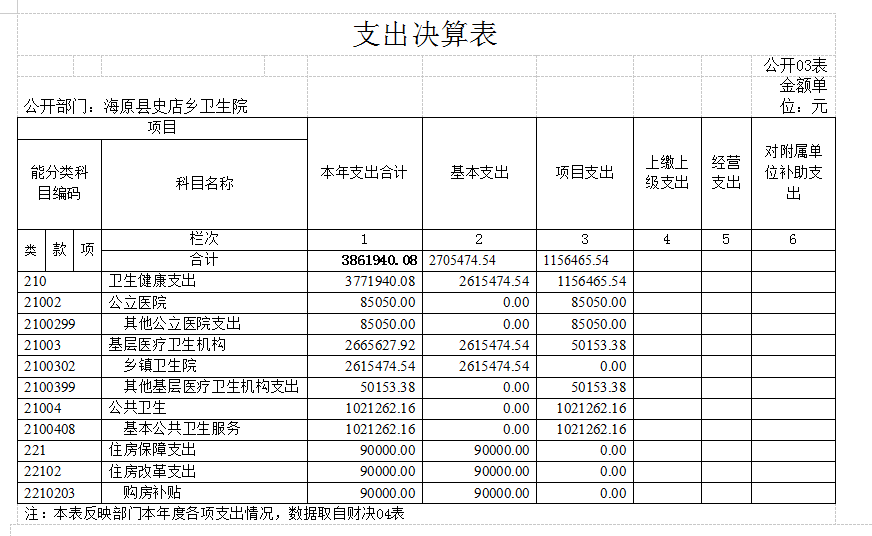 3.卫生健康支出(类)公共卫生(款)基本公共卫生服务(项)年初预算为0元,支出决算为991262.16元,超年初预算991262.16元。决算数大于预算数的主要原因是:乡镇卫生院没有分开做预算。