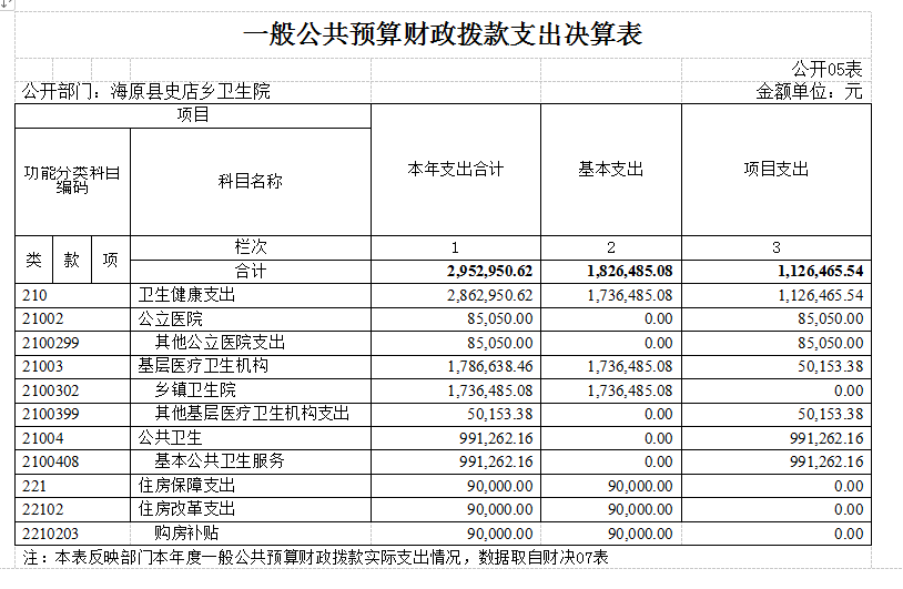 2019年度一般公共预算财政拨款支出年初预算为0元,支出决算为2952950.62元,超年初预算2952950.62元。决算数大于预算数的主要原因:乡镇卫生院预算由主管局统一做。