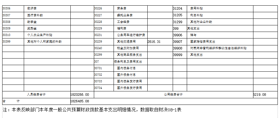 2019年度一般公共预算财政拨款基本支出1826485.08元,其中:人员经费1820266.00元,公用经费6219.08元。支出具体情况如下: