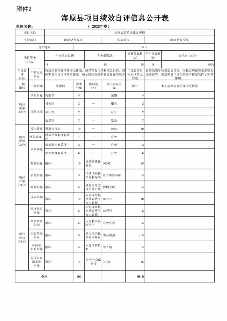 1、应急粮油储备费用项目绩效自评情况:根据年初设定的绩效目标,“应急粮油储备费用”项目自评得分为99.5分。项目全年预算数为18万元,执行数为18万元,完成预算的100%。项目绩效目标完成情况:较好的完成了项目绩效目标。存在的问题及原因:在达到服务对象的满意度方面还存在不足。下一步改进措施:进一步努力改进工作方式方法,加强政策宣传,争取服务对象的支持,提高项目实施的社会经济效益。