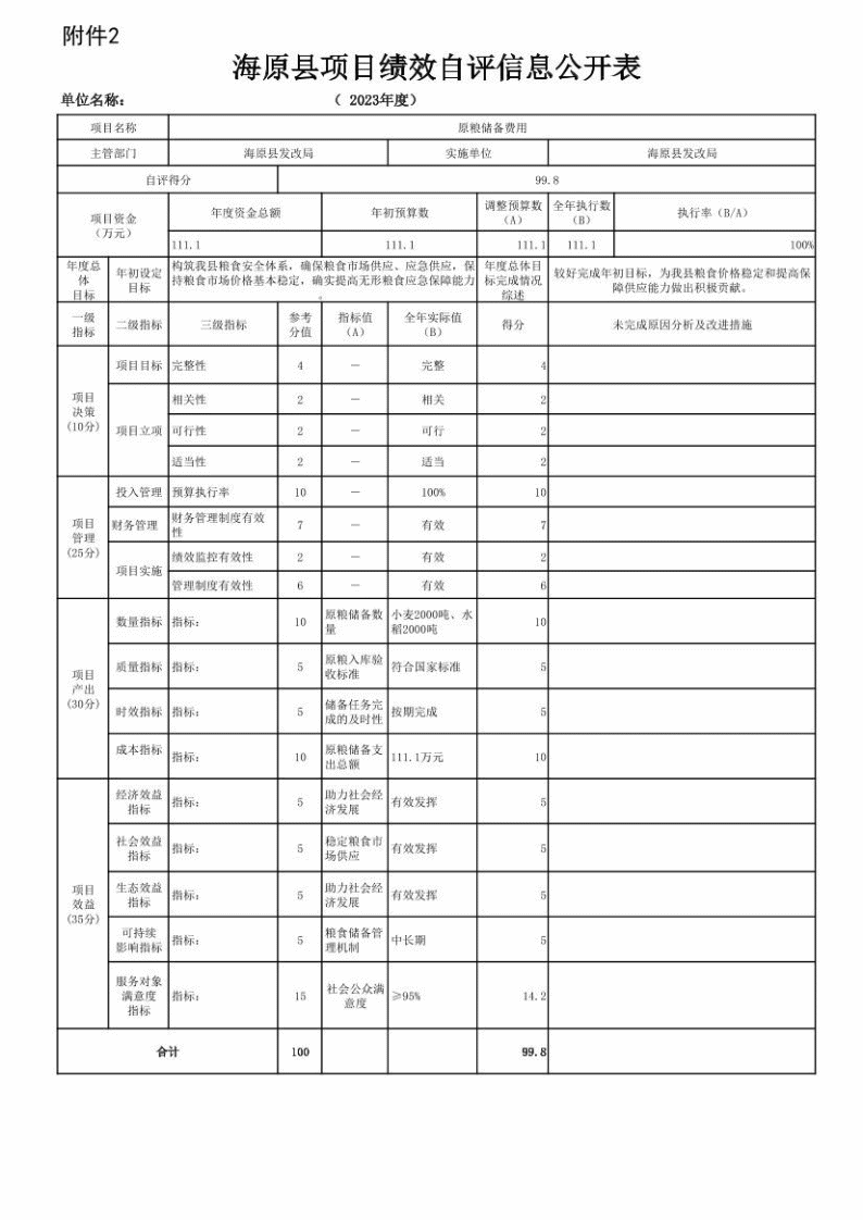 2、原粮储备费用项目绩效自评情况:根据年初设定的绩效目标,“原粮费用”项目自评得分为99.8分。项目全年预算数为111.1万元,执行数为111.1万元,完成预算的100%。项目绩效目标完成情况:较好的完成了项目绩效目标。存在的问题及原因:在达到服务对象的满意度方面还存在不足。下一步改进措施:进一步努力改进工作方式方法,加强政策宣传,争取服务对象的支持,提高项目实施的社会经济效益。