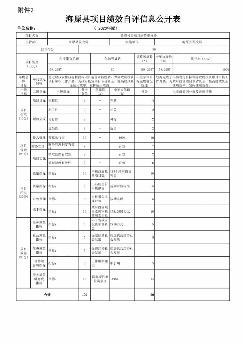 3、政府投资项目评审费用项目绩效自评情况:根据年初设定的绩效目标,“政府投资项目评审费用”项目自评得分为99.5分。项目全年预算数为158.2957万元,执行数为158.2957万元,完成预算的100%。项目绩效目标完成情况:较好的完成了项目绩效目标。存在的问题及原因:在达到服务对象的满意度方面还存在不足。下一步改进措施:进一步努力改进工作方式方法,加强政策宣传,争取服务对象的支持,提高项目实施的社会经济效益。