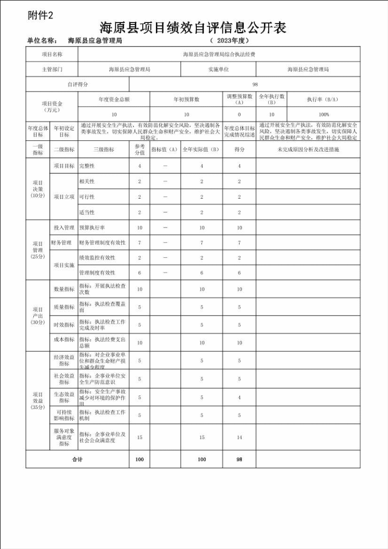 1.应急综合执法经费项目绩效自评情况:根据年初设定的绩效目标,应急综合执法经费项目自评得分为98分。项目全年预算数为10万元,执行数为10万元,完成预算的100%。项目绩效目标完成情况:通过开展安全生产执法,有效防范化解安全风险,坚决遏制各类事故发生,切实保障人民群众生命和财产安全,维护社会大局稳定。存在的问题及原因:预算执行中绩效管理缺乏科学的管理体系,还需通过不断改进,逐步完善。下一步改进措施:根据本局业务工作实际,合理地做好下一年度的项目预算工作,不断提高预算的编制能力,统筹规划,高瞻远瞩,科学预测。