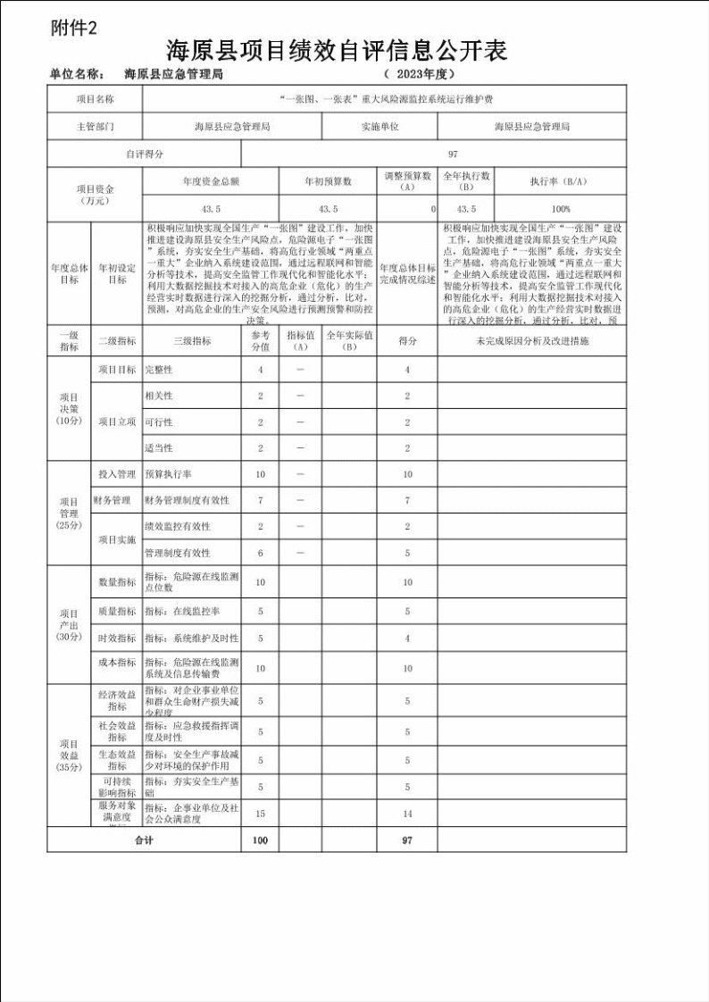 2.“一张图、一张表”重大风险源监控系统运行维护费项目绩效自评情况:根据年初设定的绩效目标,“一张图、一张表”重大风险源监控系统运行维护费项目自评得分为97分。项目全年预算数为43.5万元,执行数为43.5万元,完成预算的100%。项目绩效目标完成情况: 积极响应加快实现全国生产“一张图”建设工作,加快推进建设海原县安全生产风险点,危险源电子“一张图”系统,夯实安全生产基础,将高危行业领域“两重点一重大”企业纳入系统建设范围,通过远程联网和智能分析等技术,提高安全监管工作现代化和智能化水平;利用大数据挖掘技术对接入的高危企业(危化)的生产经营实时数据进行深入的挖掘分析,通过分析,比对,预测,对高危企业的生产安全风险进行预测预警和防控决策 。存在的问题及原因:预算执行中绩效管理缺乏科学的管理体系,还需通过不断改进,逐步完善。下一步改进措施:根据本局业务工作实际,合理地做好下一年度的项目预算工作,不断提高预算的编制能力,统筹规划,高瞻远瞩,科学预测。