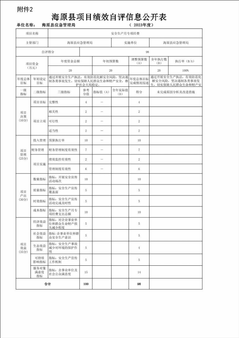 3.安全生产月宣传经费项目绩效自评情况:根据年初设定的绩效目标,安全生产月宣传经费项目自评得分为98分。项目全年预算数为20万元,执行数为20万元,完成预算的100%。项目绩效目标完成情况:通过开展安全生产执法,有效防范化解安全风险,坚决遏制各类事故发生,切实保障人民群众生命和财产安全,维护社会大局稳定。存在的问题及原因::通过对2023年安全生产月宣传经费的自评分析,我局在社会经济效益方面存在欠缺,全民安全防范意识虽有提升,但总体来说还有安全生产事故情况发生。下一步改进措施:继续加大宣传力度,普及安全生产知识,使安全生产工作深入人心。