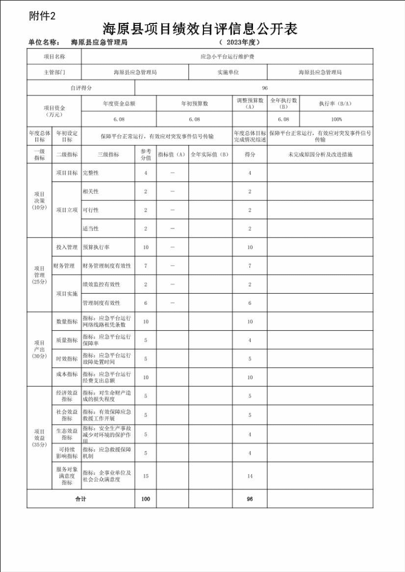 4.应急小平台运行维护费项目绩效自评情况:根据年初设定的绩效目标,应急小平台运行维护费项目自评得分为96分。项目全年预算数为6.08万元,执行数为6.08万元,完成预算的100%。项目绩效目标完成情况:保障平台正常运行,有效应对突发事件信号传输。存在的问题及原因:预算执行中绩效管理缺乏科学的管理体系,还需通过不断改进,逐步完善。下一步改进措施:我局要在今后的工作中,继续运用好应急小平台,不断提升我县的安全生产工作,保障群众生命财产安全。