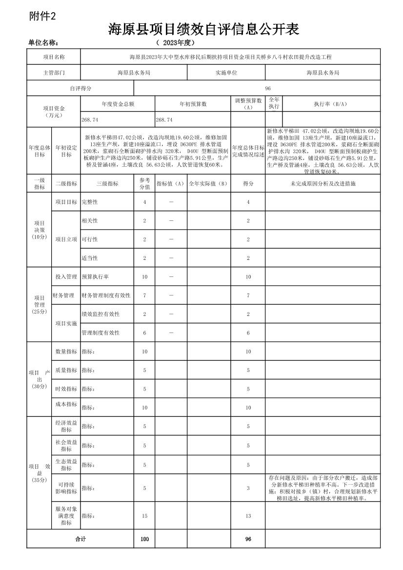 2023年海原县水务局项目支出绩效目标申报表(八) | |||||||||||