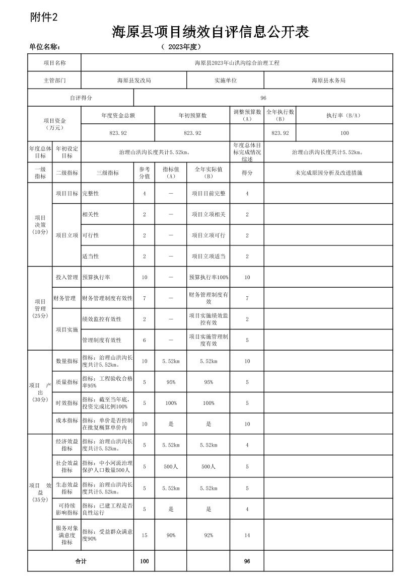 2023年海原县水务局项目支出绩效目标申报表(五) | |||||
