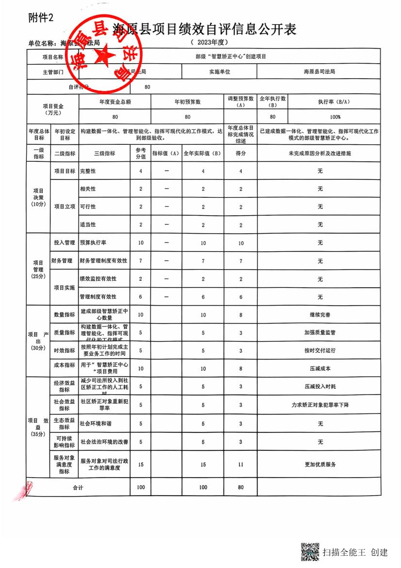 2.海原县司法局开展2023年中央配套“部级智慧矫正中心”创建项目自评情况:根据年初设定的绩效目标,海原县司法局开展2023年中央配套“部级智慧矫正中心”创建项目自评得分为80分。项目全年预算数为80万元,执行数为80万元,完成预算的100%。项目绩效目标完成情况:良。存在的问题及原因:鉴于项目实施中出现的资金支出缓慢问题,下一步改进措施:将及时紧跟项目进度,严格按照项目管理办法,对项目进度按照比例支出。