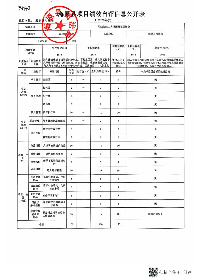 4.海原县司法局开展2023年司法协理员报酬及社保缴费项目资金绩效自评情况:根据年初设定的绩效目标,海原县司法局开展2023年司法协理员报酬及社保缴费项目资金绩效自评得分为100分。项目全年预算数为56.7万元,执行数为56.7万元,完成预算的100%。项目绩效目标完成情况:良。存在的问题及原因:针对司法协理员报酬偏低问题,下一步改进措施:我局及时和县主要领导汇报,提请财政按照最低社会平均工资予以执行。