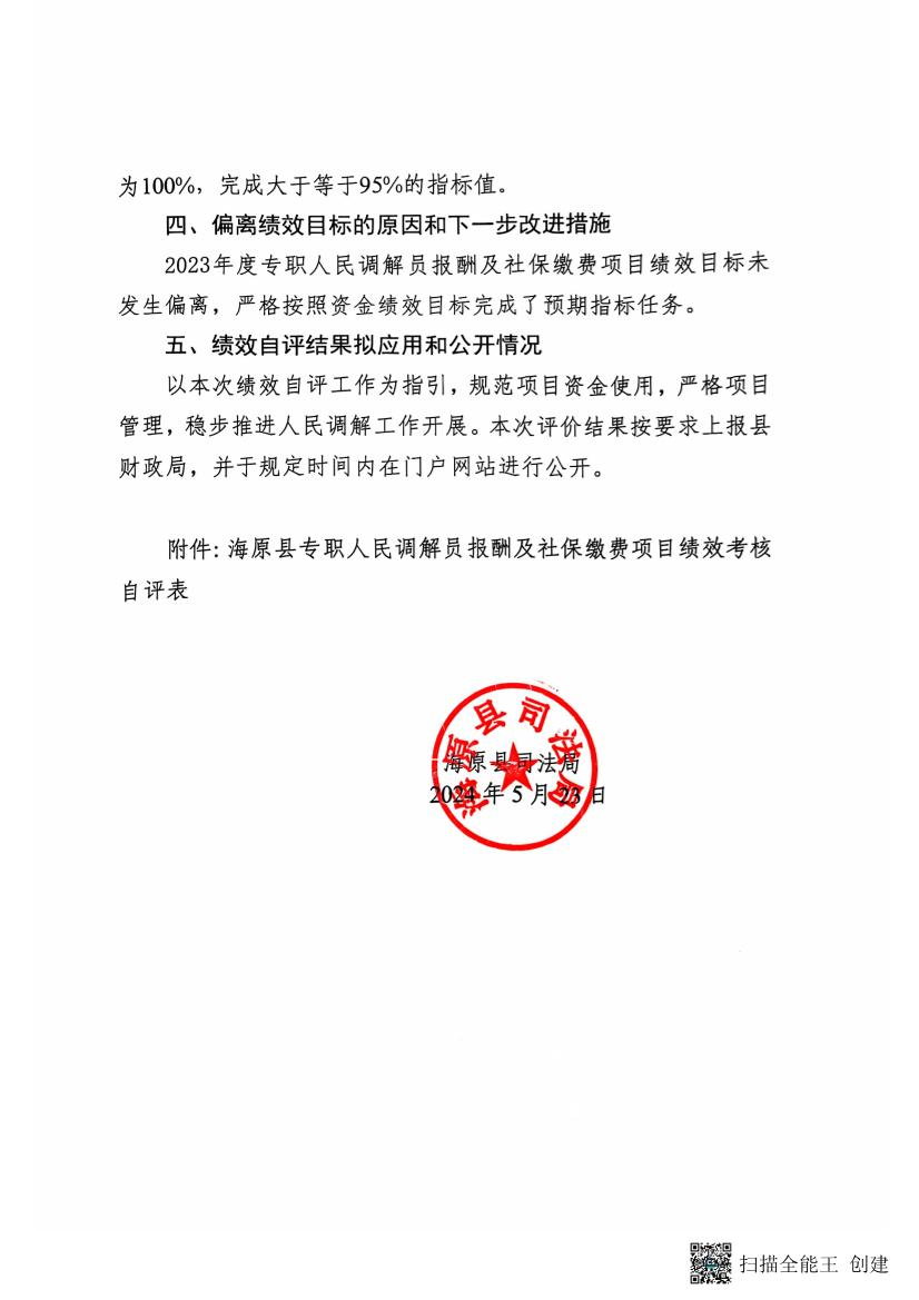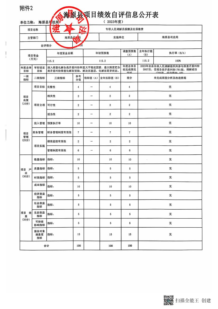 3.海原县司法局开展2023年专职人民调解员报酬及社保缴费项目资金绩效自评情况:根据年初设定的绩效目标,海原县司法局开展2023年专职人民调解员报酬及社保缴费项目资金绩效自评得分为100分。项目全年预算数为115.2万元,执行数为115.2万元,完成预算的100%。项目绩效目标完成情况:良。存在的问题及原因:针对专职人民调解员报酬偏低问题,下一步改进措施:我局及时和县主要领导汇报,提请财政按照最低社会平均工资予以执行。
