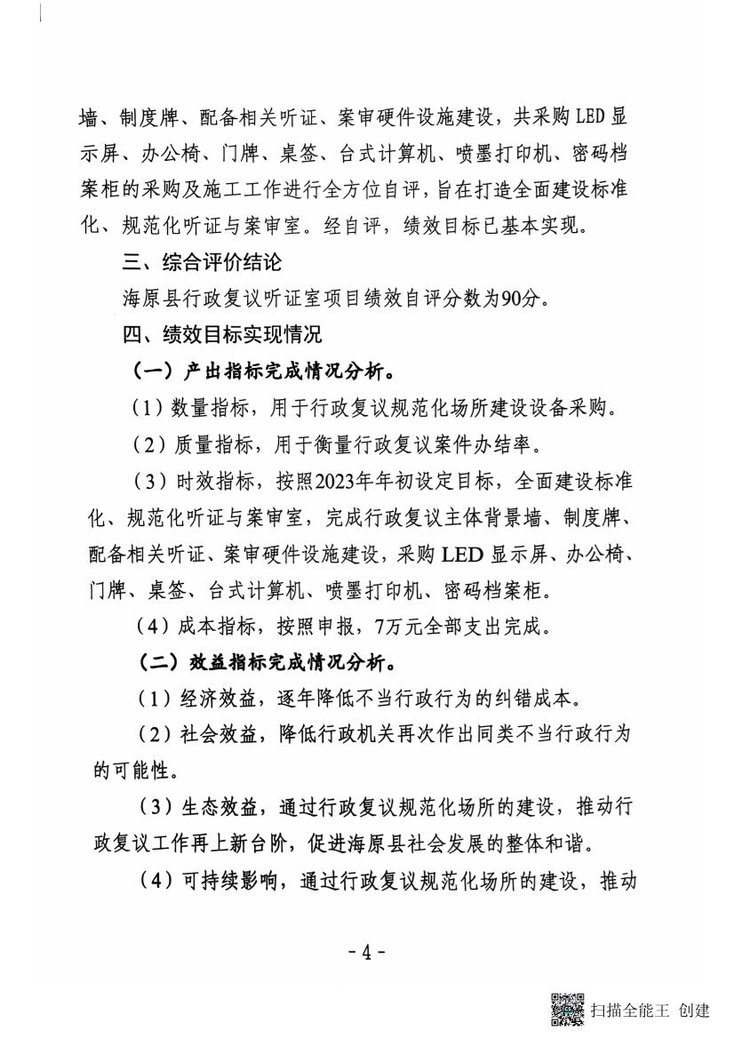 5.海原县司法局开展行政复议听证室项目自评情况:根据年初设定的绩效目标,海原县司法局开展行政复议听证室项目自评得分为90分。项目全年预算数为7万元,执行数为7万元,完成预算的100%。项目绩效目标完成情况:良。存在的问题及原因:根据项目实施过程中,有部分设备还不完善问题,原因是客观存在的,下一步改进措施:我局将积极争取资金支持,做好行政复议室硬件设施投入,为政府做好服务。