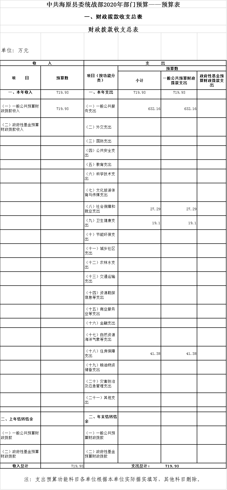 统战部2020年收入总预算719.93万元,其中:本年收入 719.93万元,上年结转结余 0万元;支出总预算 719.93万元,其中:本年支出 719.93万元,年末结转结余 0万元。