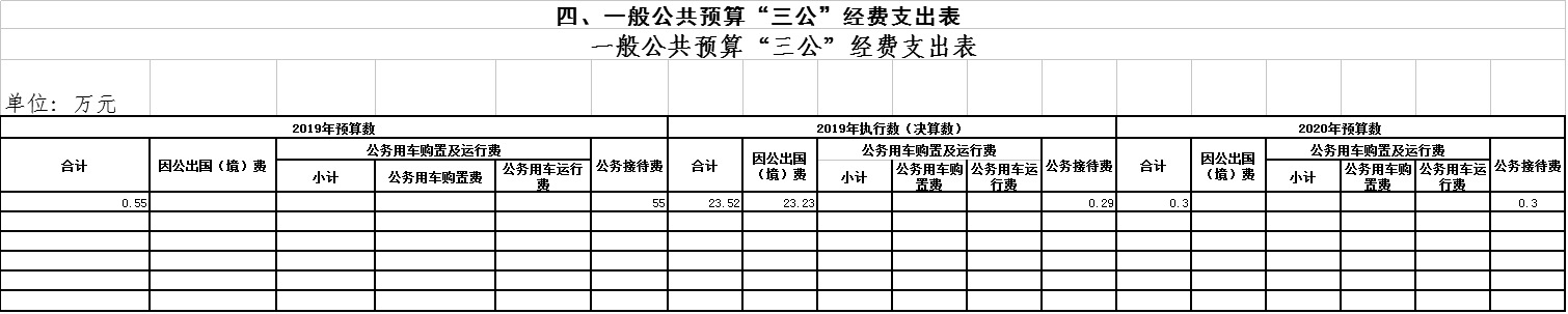 2020年“三公”经费财政拨款预算比2019年(减少) 0.1万元,其中:因公出国(境)费增加(减少)0万元,主要原因……;公务用车购置费增加(减少)0万元,主要原因……;公务用车运行费增加(减少)0万元,主要原因……;公务接待费(减少)0.1万元,主要原因:严格执行“中央八项规定”,压缩公务接待费开支,所以2020年一般公共预算财政拨款“三公”经费-公务接待费减少0.1万元。
