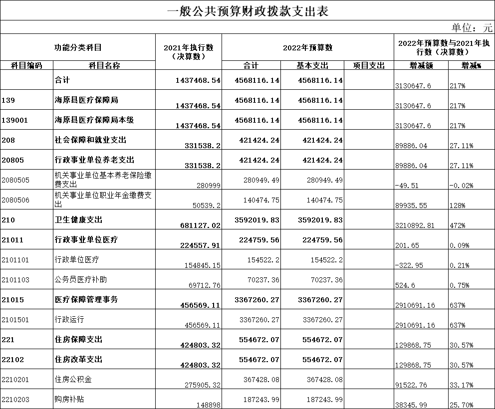 海原县医疗保障局2022年一般公共预算财政拨款基本支出4568116.14元,其中:本年收入安排支出4568116.14元,上年结转资金安排支出0元。比2021年执行数(决算数)增加743444.68元,增长19.44%。