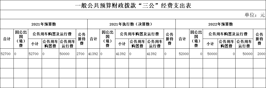 2022年“三公”经费财政拨款预算比2021年减少700元,其中:因公出国(境)费增加0元,主要原因无因公出国(境)费;公务用车购置费增加0元,主要原因无公务用车购置费;公务用车运行费增加0元,主要原因是2022年预算数同2021年;公务接待费减少700元,主要原因压缩2022年公务接待费。